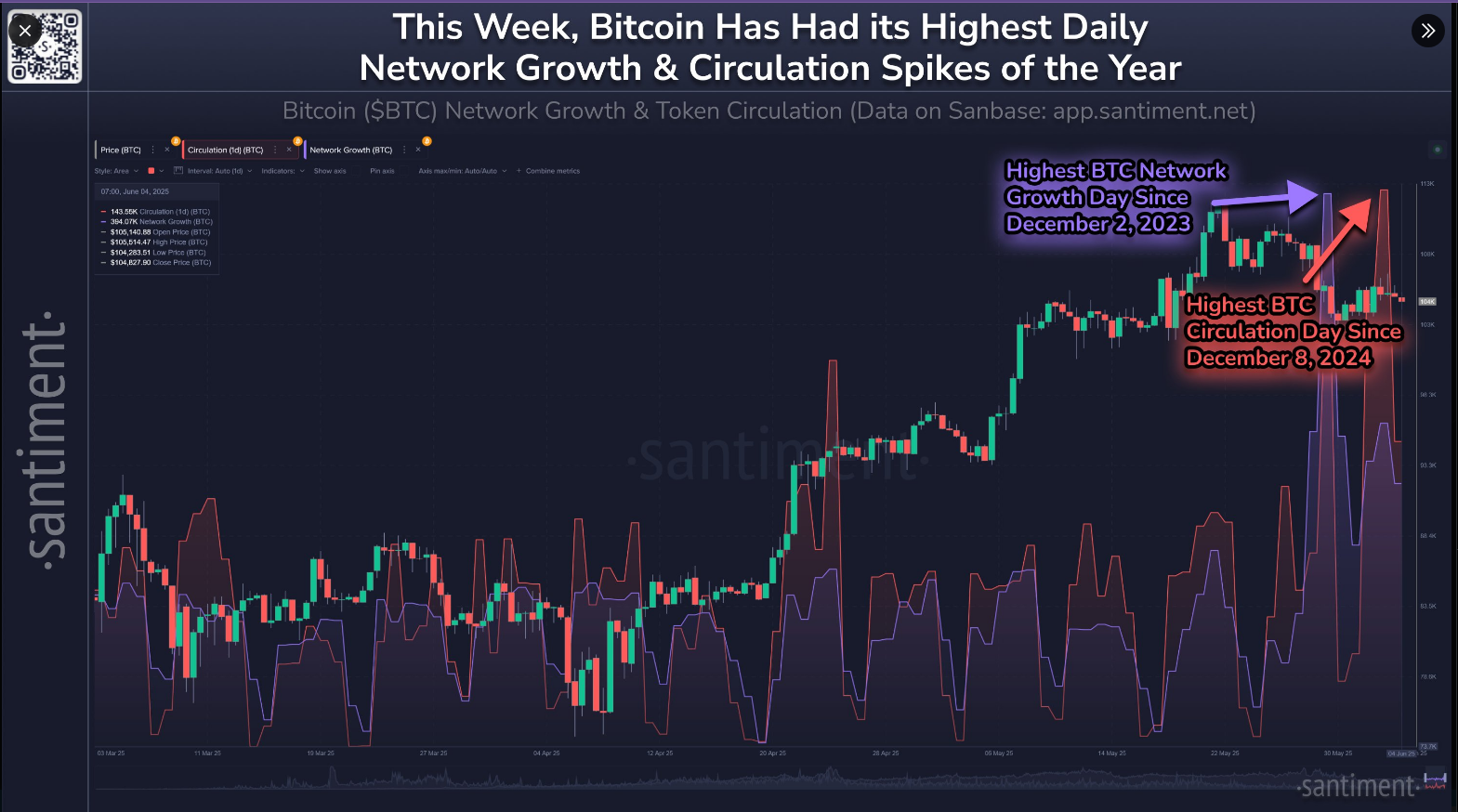 Bitcoin’s price has barely moved in the last week, but other signs point to growing activity on the network. On June 5, Bitcoin traded around $104,300, down 0.50% in 24 hours and off 2.5% over the past seven days. Yet data shows more people are joining the network, and more coins are being passed around.