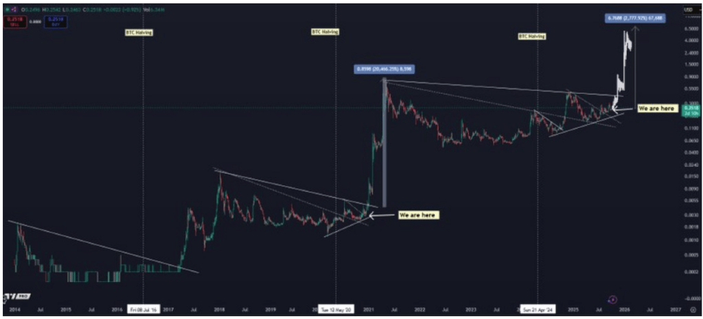 On a broader timeframe, crypto market expert Kaleo has pointed out that Dogecoin’s market structure is gradually positioning itself for a major upward move. His long-term chart analysis draws striking parallels between DOGE’s current price action and the previous cycles observed before each Bitcoin halving event .