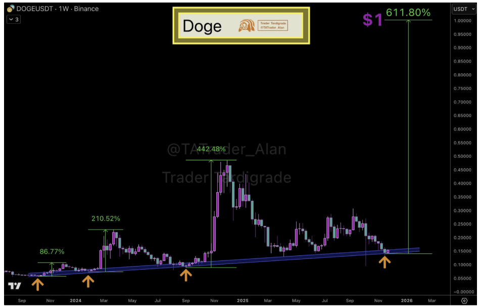 The analyst says the pattern is intact once again, and if the support at $0.15 holds, Dogecoin could follow the same structure into a larger expansion phase. Based on his projection, that continuation would give Dogecoin enough momentum to make a gradual 610% climb to $1 by 2026.