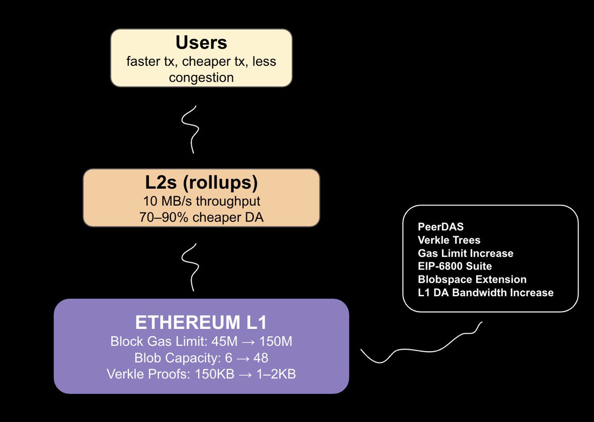 T-7 days to fusaka. this is MASSIVE for Ethereum’s scaling roadmap: - block gas-limit increase: ~45M → 150M - PeerDAS: blob capacity 6 → 48 - verkle trees: 150KB → ~1-2KB - L2 throughput: ~1.3 MB/sec → ~10 MB/sec - L2 calldata: 70–90% cheaper what do these mean? 1. scaling and value accrual – more adoption, more economic activity – more demand for ETH blockspace + gas 2. better L2 economics – rollups become much cheaper – users + devs get a far better experience 3. lower barrier for validators – PeerDAS + Verkle reduce bandwidth/storage – easier to run nodes, stronger decentralization 4. better UX – more predictable fees – faster confirmations on L2 – less congestion ethereum is evolving faster than anyone realizes.