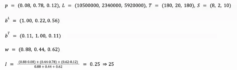 假設我們決定將三個市場的評分設為 8、2 和 10,那麼每個市場的權重將是: