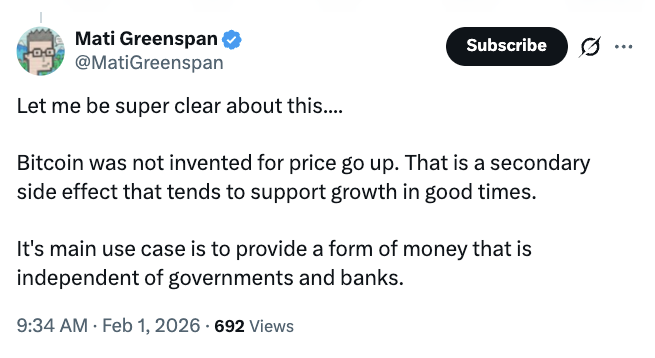 最后,一个有趣的观点来自行业内部。Quantum Economics的首席执行官Mati Greenspan提醒我们,或许我们一直以来都关注错了重点。他在社交媒体上写道,比特币的核心设计目标是成为一种独立于传统银行体系的货币,价格升值只是其可能带来的“副作用”,而非存在的意义。这个观点像一盆冷水,让我们思考:当市场只关注价格涨跌时,是不是已经偏离了它最初的愿景?