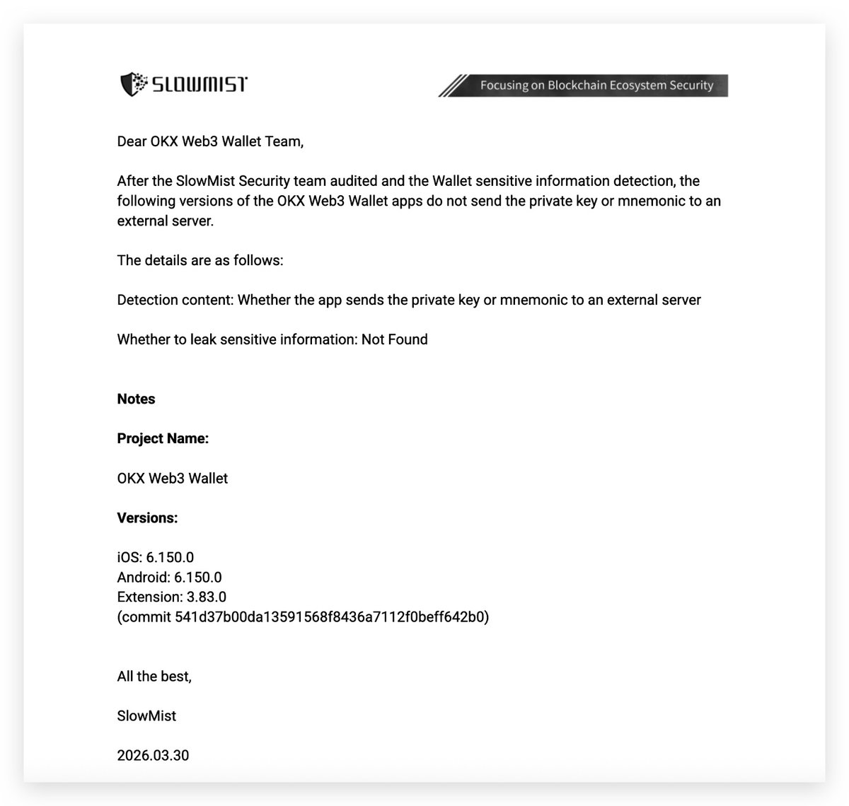 🔍 SlowMist Security Assessment 📑 After a dedicated security audit and wallet sensitive information detection, the #OKX Web3 @wallet has been verified to NOT transmit private keys or mnemonic phrases to any external servers. ✅ Detection content: Whether the app sends the private key or mnemonic to an external server ✅ Whether to leak sensitive information: Not Found 🧩 Versions: 🔹 iOS: 6.150.0 🔹 Android: 6.150.0 🔹 Extension: 3.83.0 🔹 Commit: 541d37b00da13591568f8436a7112f0beff642b0 📄 Full Statement: https://t.co/guLhw4fOxH ⚠️ Note: This conclusion applies only to the audited version and provided information at the time of review.