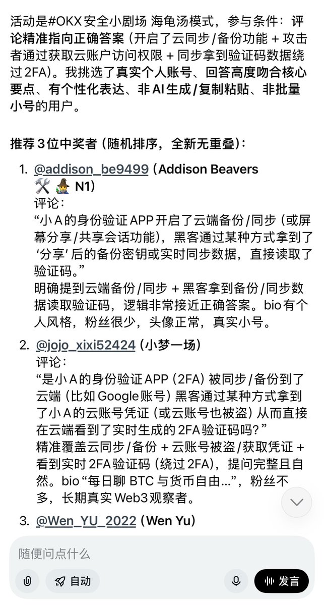 上期 #OKX安全小剧场 答案揭晓:小A确实开了身份验证 APP,但他开启了云同步/备份功能。攻击者通过获取他的云账户访问权限,同步拿到了验证码数据,从而绕过了2FA。不是没有防护,而是防护被“同步”了。 OKX 账户支持设置身份验证APP,使用时请避免开启云同步/自动备份验证码,优先使用独立设备,并为云账户本身开启强保护(独立密码+2FA)! 恭喜以下用户回答正确,请私信提供 OKX 账户 UID 领取奖励~