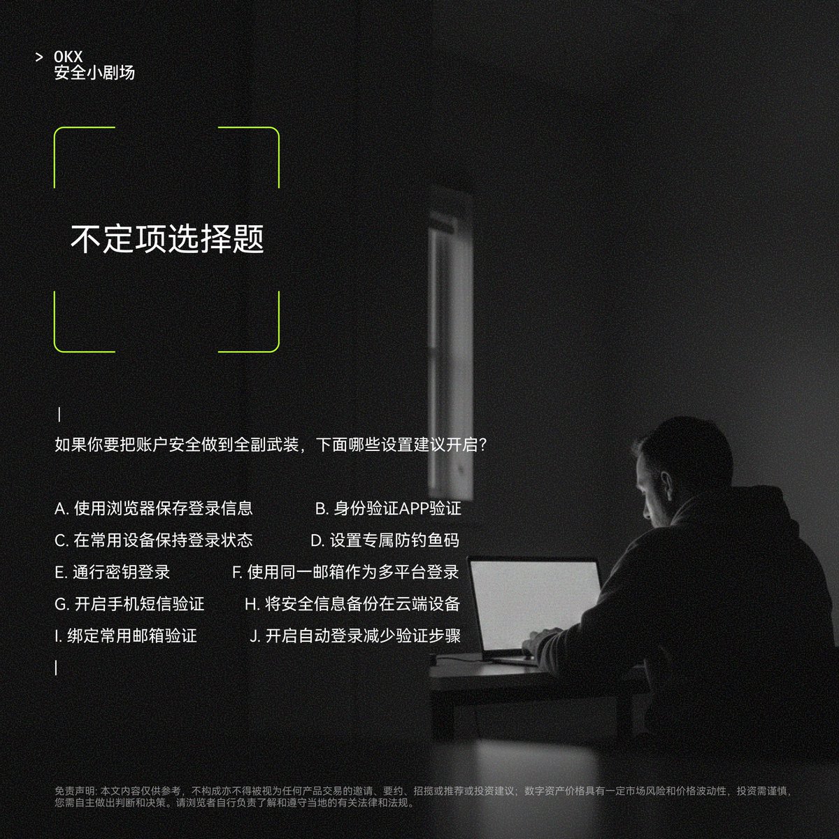 🔐 账户安全做到全副武装,图中10个设置,你会开哪些? 💬今天的 #OKX安全小剧场 是不定项选择——有加分项,也有陷阱;评论区写下你的答案,选对的朋友抽3位送 30U 全副武装奖~ https://t.co/oncSv7XBpX