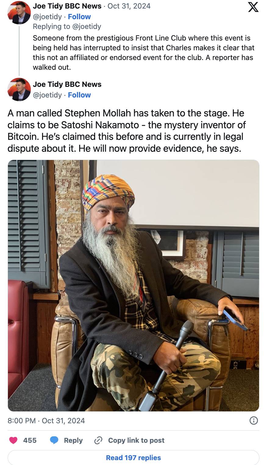 Stephen Mollah 是一位英亚裔宏观经济学家,他表示自己早就想揭露真实身份,但总是被阻止。在一场门票高达 500 英镑的活动中,他不仅宣称自己是比特币的创造者,还声称设计了 Twitter 的标志、开发了 ChatGPT,并发明了一种名为 Eurobond 的债务工具。