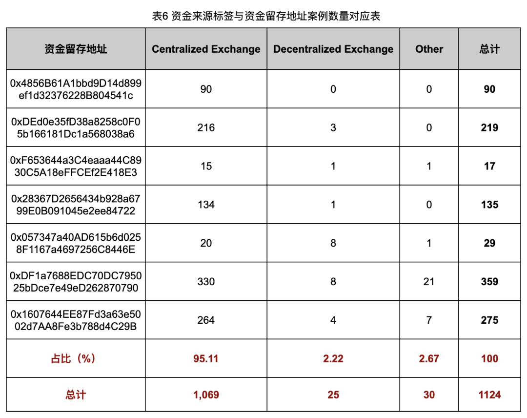 表6展示了各资金留存地址中关联Rug Pull案例的Deployer资金来源标签的数量分布情况。