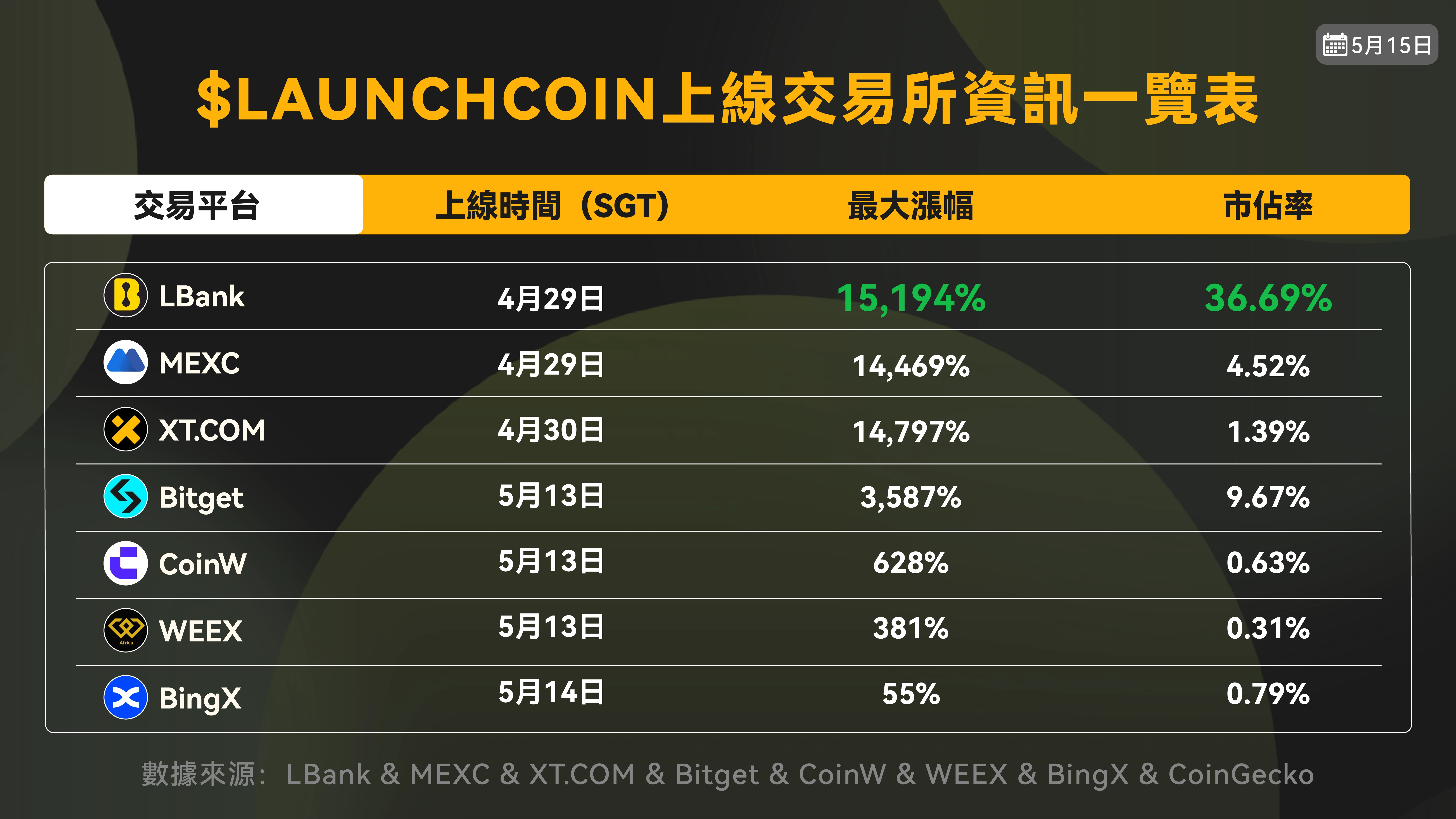 进入 5 月,LBank 在 Meme 资产领域持续领跑,特别是在新势力 PK 加剧的阶段,平台在 LetsBook 与 Believe 系项目上的快速响应,明显快于其他主流平台。在布局节奏与投放窗口的精准把控下,DUPE 与 LAUNCHCOIN 两大项目借助极致的社区传播力与平台级联动支持,分别实现了 13, 367% 与 15, 194% 的最大涨幅(数据截至 5 月 15 日),不仅成为本轮行情中的明星资产,也再次印证了 LBank 在爆款识别与兑现效率上的行业领先地位,其“爆款孵化器”形象进一步巩固。