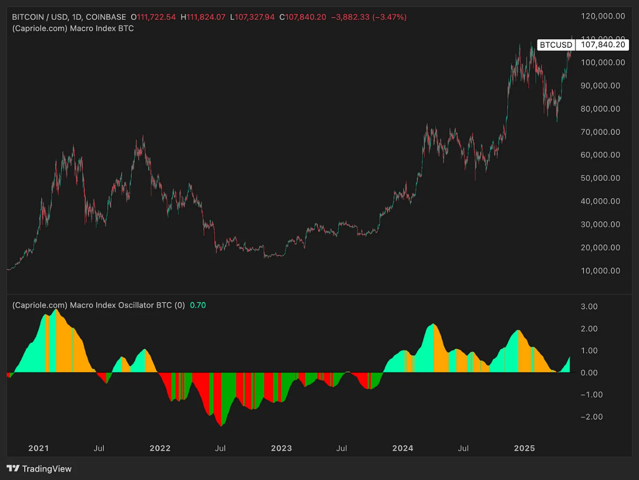 在之前的牛市周期中,该指标从负值区域过渡到强劲正值区域——在 2021 年接近 2 至 3 的峰值。在 2022 年触底时,该指标跌破 -1 。截至目前,宏观指数约为 + 0.7 ——显然处于增长阶段,但仍远低于狂热的极端水平。
