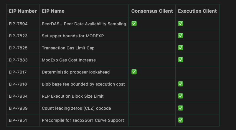 下表总结了哪些以太坊客户端需要针对不同的 Fusaka EIP 进行更改。共识客户端下的勾选标记表示该 EIP 需要更新共识层客户端,而执行客户端下的勾选标记则表示该升级影响执行层客户端。某些 EIP 需要同时更新共识层和执行层,而其他 EIP 则仅需更新其中一层。