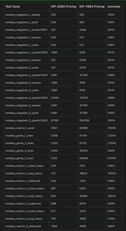 为了解决这个问题,以太坊需要调整 ModExp 的定价公式,使 Gas 消耗能够准确反映客户端实际完成的工作量。因此, EIP-7883 引入了新的规则,提高了最低 Gas 成本、提高了总 Gas 成本,并使输入数据量较大的操作(尤其是超过 32 字节的指数、底数或模数运算)更加昂贵,从而使 Gas 定价与实际所需的计算量相匹配。