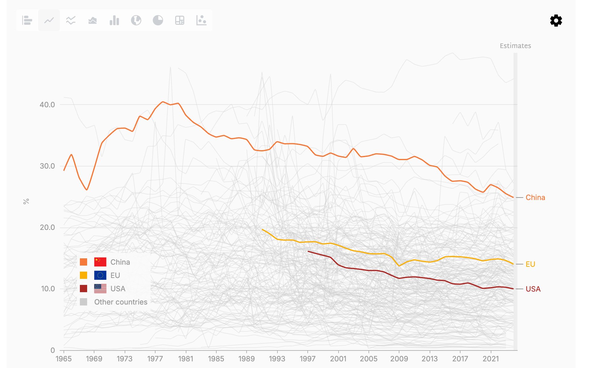 然而针对欧盟,故事又是另一个版本。中国对欧盟出口商品中,工业制成品的占比更高,因此利润率相比于东盟等其他市场来说也更高。因此欧洲自然是中国稳定币贸易盈余的重要市场,而中欧之间的贸易结算以欧元为主,为了提升本国商品在该市场的影响力,人民币对欧元的汇率有理由保持一个更低的水平。