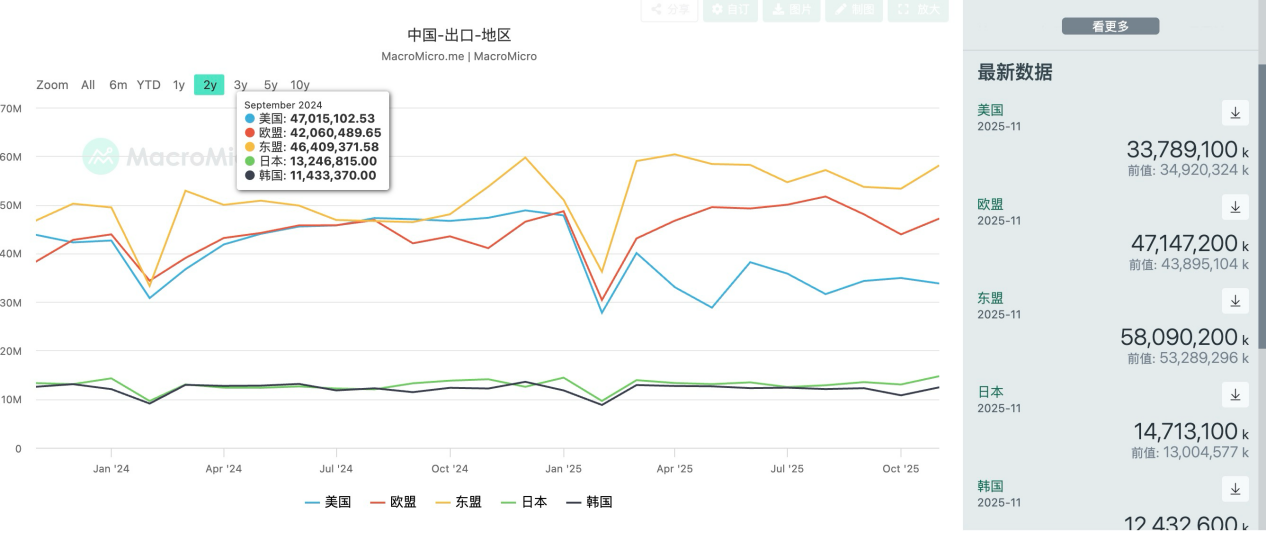 我们来看一下中国的出口数据,可以看到,目前在出口占比重最高的三位分别是东盟、欧盟和美国。受贸易战的影响,中国对美国的出口有明显下降的趋势,当然我们不讨论转口问题。而增量贡献中最明显的还是欧盟和东盟。