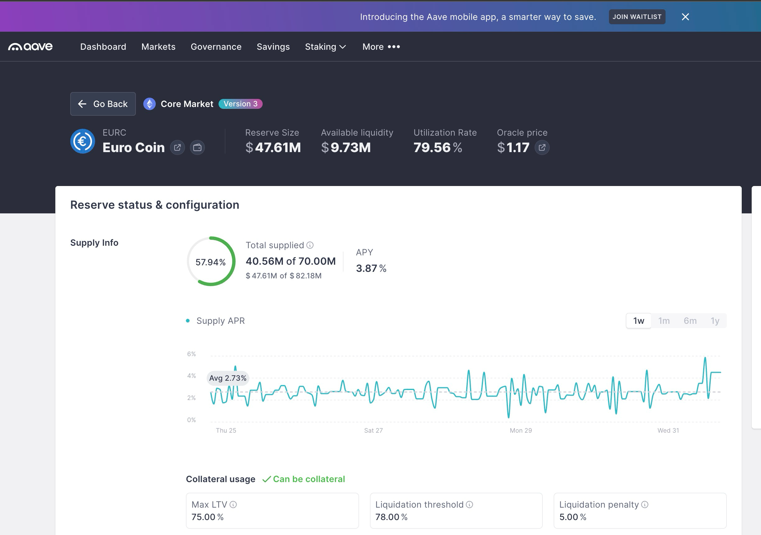回到汇率对冲策略来说,笔者认为一个切实可行的策略是将美元稳定币兑换为EURC,然后可以选择存放到AAVE等头部平台赚取利息,以当前利用率来看,出借利率可以达到3.87%,也是比较香的。如果想保持对BTC等风险资产的头寸,又想对冲汇率风险,可以选择以EURC作为抵押品,借出美元稳定币,再进行资产配置,例如购入BTC