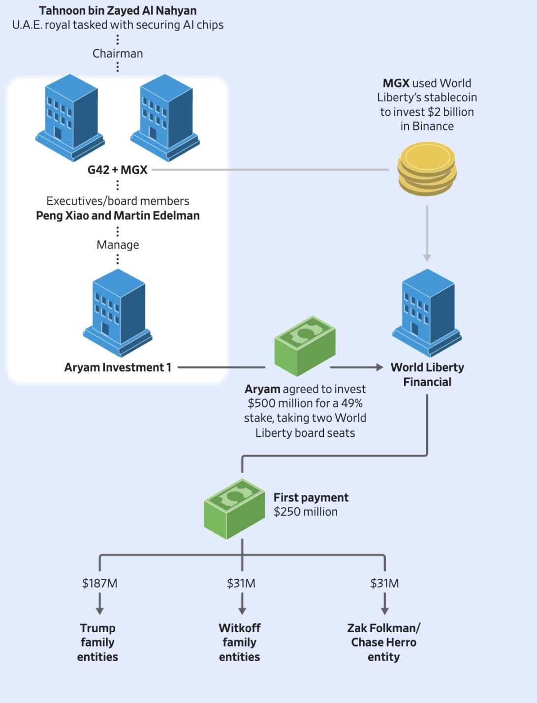 美阿芯片协议于去年 5 月公布前数周,World Liberty Financial 首席执行官 Zach Witkoff 宣布,Tahnoon 牵头的投资公司 MGX 将使用 World Liberty Financial 发行的稳定币,完成对加密货币交易所币安的 20 亿美元投资。进入 World Liberty Financial 董事会的 G42 高管,同时也在与 G42 联合拥有的 MGX 担任董事。