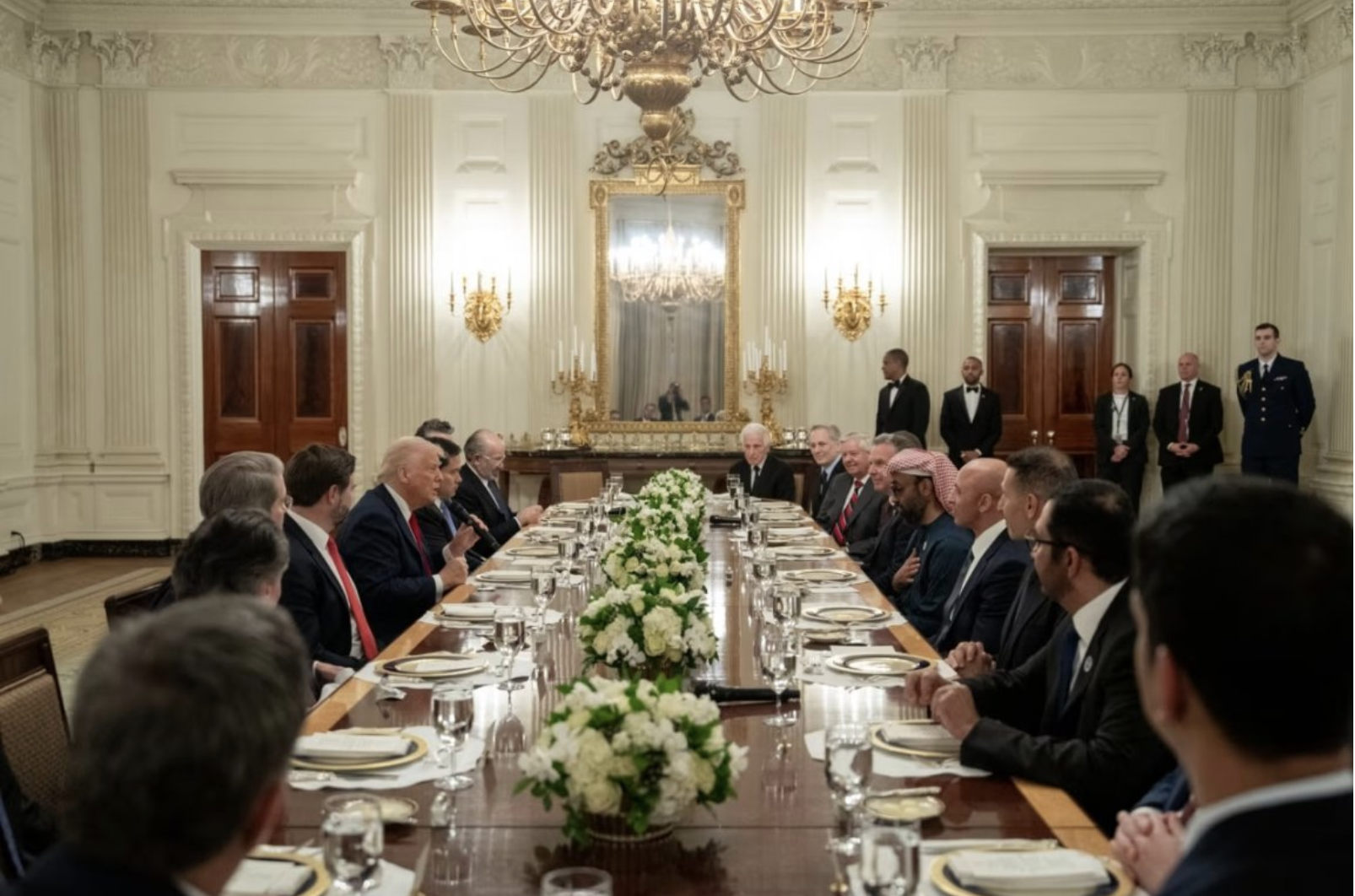 3 月 18 日,特朗普在白宫为 Tahnoon 及其代表团举办晚宴,邀请副总统及国务卿、商务部长、财政部长等内阁成员出席。Tahnoon 坐在 Witkoff 身旁,Edelman 坐在餐桌末端。特朗普随后在 Truth Social 发布照片,宣扬两国间的 「友谊纽带」,称双方讨论了加强经济与技术领域的合作。