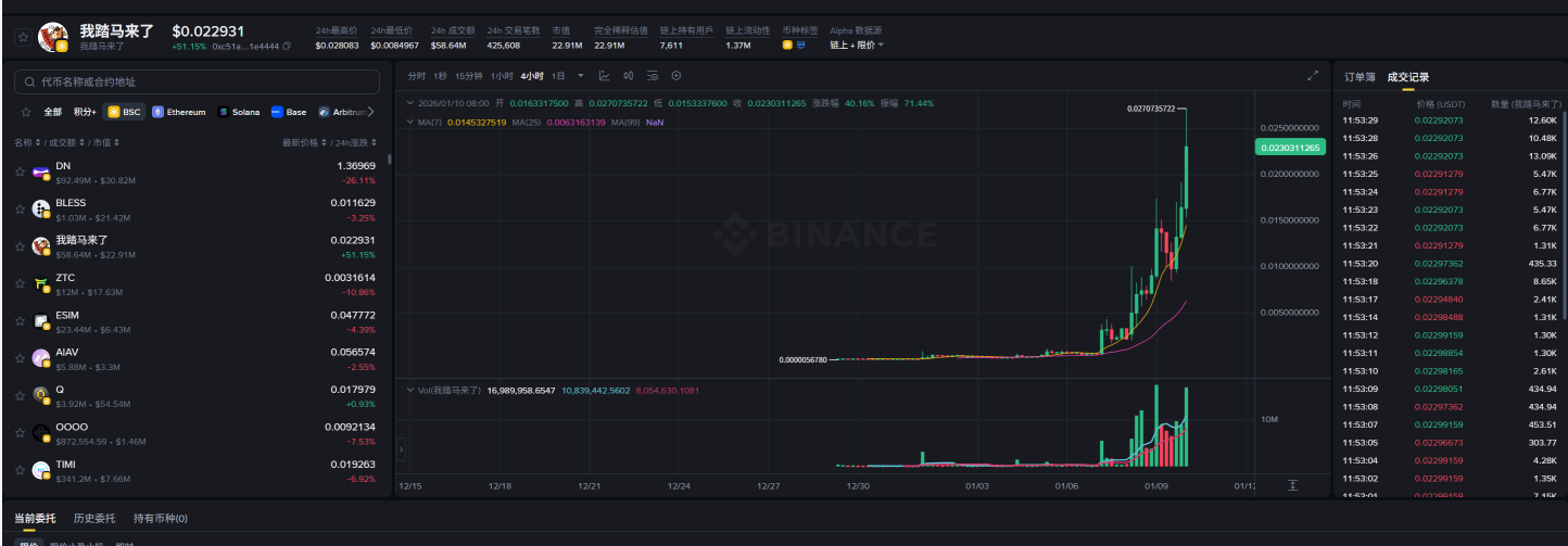 从实际动作来看,币安的Meme布局早已形成完整链路:推出币安钱包降低用户参与门槛,设立Alpha板块专门承接Meme类资产,与多家Meme发布平台达成合作拓宽资产来源,同时通过发布Meme榜单引导市场关注方向。此次上线“我踏马来了”,正是这一战略布局的关键落子——选择一款与自身生态(何一言论)深度绑定的中文Meme币,既能精准触达中文社群用户,又能强化平台与Meme赛道的绑定关系,无疑是兼顾商业利益与生态发展的最优解。