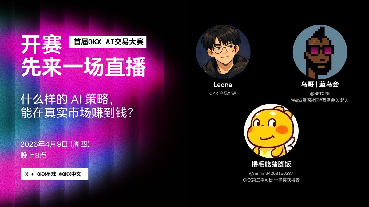 今晚 20:00,星球开播! 首届 OKX AI 交易大赛今日开赛,还不知道怎么玩? 直播一次讲透——「怎么写 Skill」「比赛怎么赢」 √ Skill Marketplace 新功能首发演示 √ 手把手教你写出第一份 SKILL.md √ 直播间还有神秘礼包等你解锁 @NFTCPS @mnmn94253156337 https://t.co/GhI82dBy4X