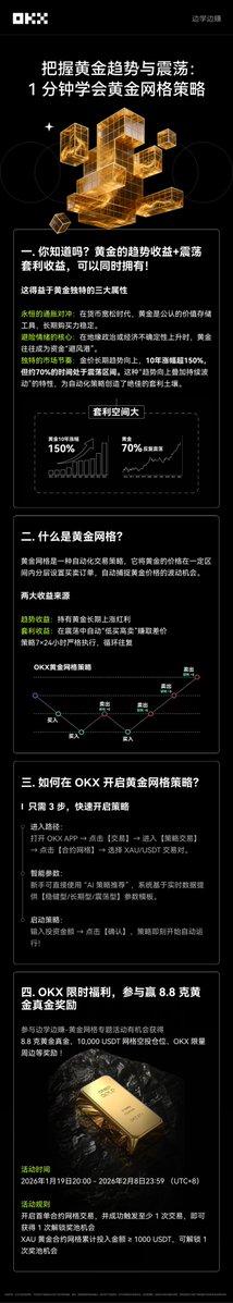 想同时赚取黄金的上涨红利与波动价差? 就在 OKX 黄金网格策略! 如同24小时在线的交易员 自动执行“低买高卖” 帮你一网打尽双重收益 👇🏻 参与限时活动,还有机会赢取8.8克真金大奖!