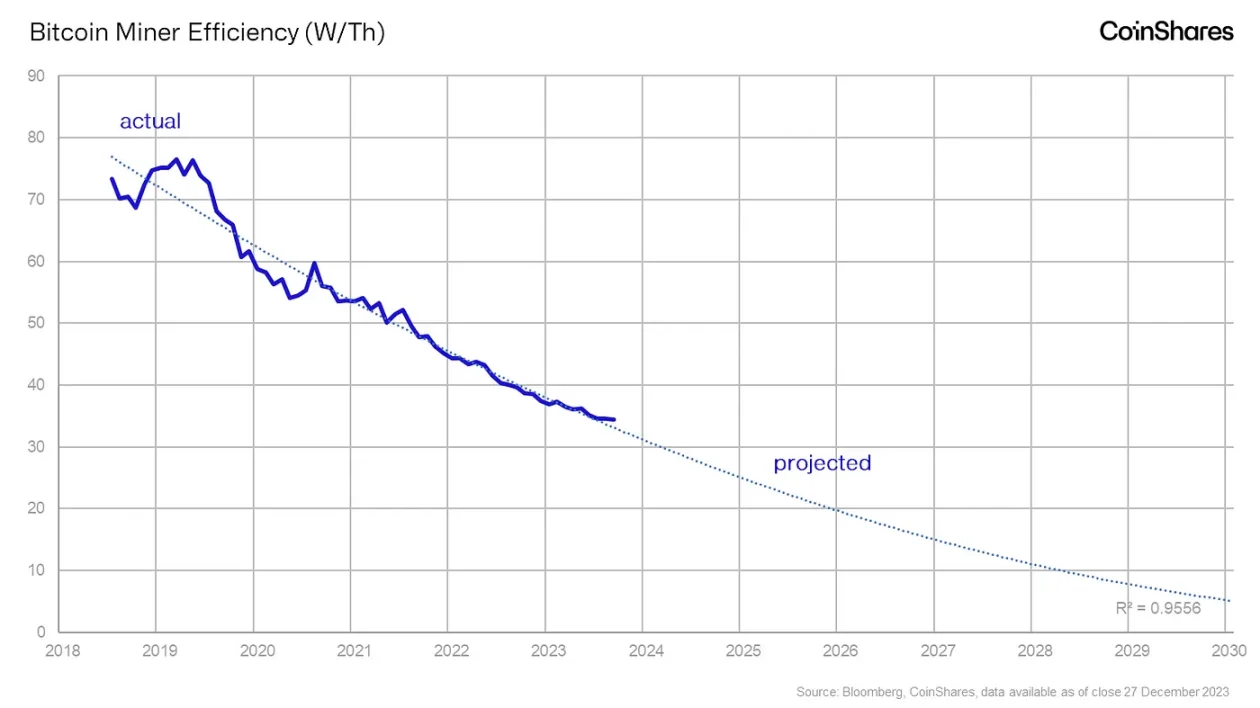 由于每个挖矿模型的效率以 W/T 为单位,因此可以计算整个比特币挖矿网络的整体效率。鉴于这一趋势相对线性,未来的趋势也可以预测。