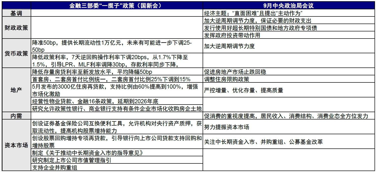 当前中国增长问题的根源是持续的信用收缩,私人部门持续的去杠杆,且政府部门信用扩张未能起到有效对冲。造成这一局面的原因一是投资回报率预期低,尤其是地产和股市价格的低迷,二是融资成本还不够低。而本轮政策变化的核心均是沿着降低融资成本(下调多项利率)和提振投资回报预期(稳房价与提供股市流动性支持)两条思路展开,属于是对症下药,是否药到病除,实现中长期可持续的再通胀,则还需要后续结构性的财政刺激和实际政策落地执行,否则市场的复苏可能昙花一现。