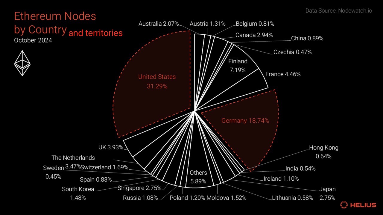 相比之下,以太坊节点分布在 83 个不同的国家和地区,其中近一半位于美国和德国。