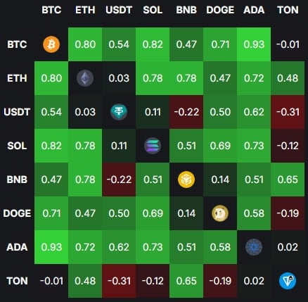 TON 與其他主流加密貨幣的相關性依然較低,例如與 BTC 和 ETH 的相關性分別為 -0.01 和 0.48,顯示其市場表現仍然獨立於主流趨勢。本週 TON 與 SOL 和 DOGE 的相關性亦下滑至負值區間,表明該代幣未受到主流資金熱度的帶動。