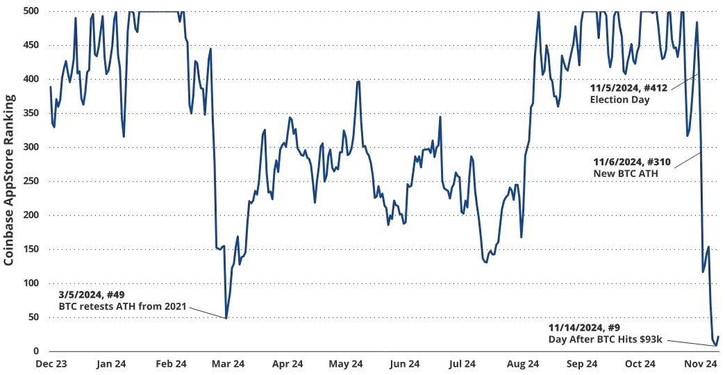 与 Google 对「加密货币」的搜索热度类似,Coinbase 在应用商店中的排名也是衡量散户投资兴趣的重要指标。今年 3 月 5 日,在比特币价格于 9 天内飙升约 34% ,并重新测试 2021 年的历史高点约 69, 000 美元后,Coinbase 重新进入了应用商店排名前 50 名。尽管比特币在同月后期达到约 74, 000 美元的新高,但随着价格波动性下降至夏季低迷期,并且公众注意力转向总统选举,散户兴趣有所减弱。然而,比特币在选举之夜的突破再次点燃了散户的兴趣,Coinbase 的应用商店排名从 11 月 5 日的第 412 名跃升至 11 月 14 日的第 9 名。参与度的激增推动价格的进一步上涨,同时创下了比特币 ETF 流入量的新纪录。