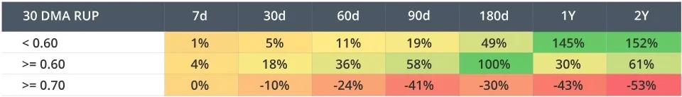 对过去两轮市场周期的分析表明, 30 DMA RUP 在 0.60 和 0.70 之间的水平通常能带来最高的短期至中期回报(7 天至 180 天)。这一区间通常反映牛市的中期阶段,此时市场乐观情绪正在上升,但尚未达到过度水平。相比之下,当 RUP 超过 0.70 时,各时间范围内的回报率始终呈现负相关,强化了其作为强力卖出信号的作用。