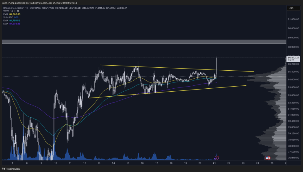 交易員 Saint Pump 釋出推文稱,比特幣空頭在這次上揚中被擠壓,現在目光焦點是 8.8 萬美元。