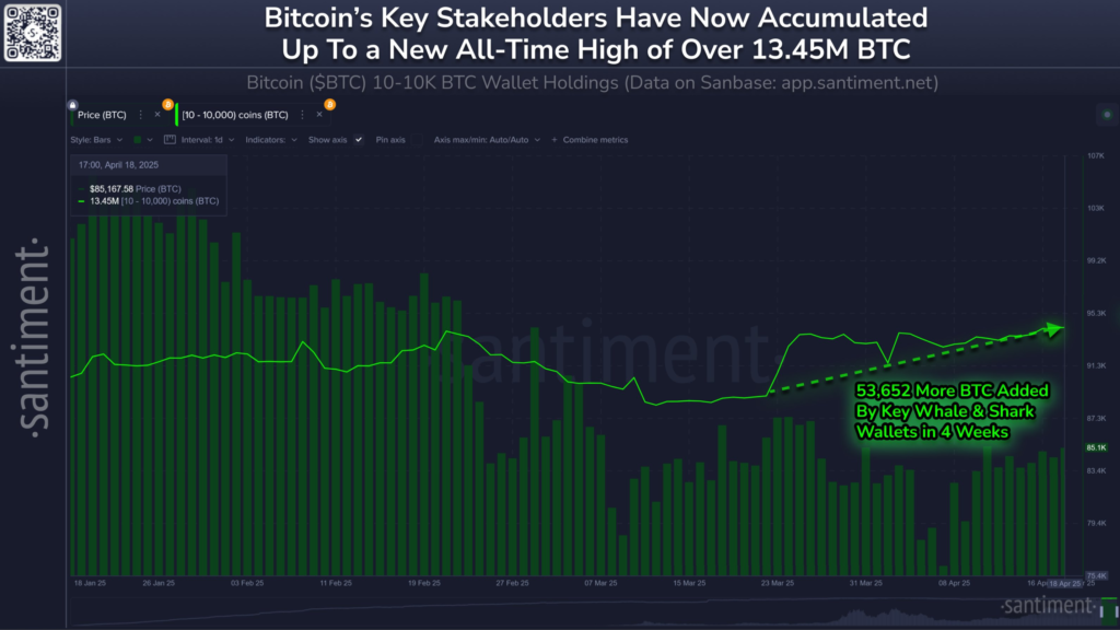 Santiment 釋出的資料圖顯示,持有 10 枚至 1 萬枚比特幣的錢包作為比特幣的關鍵利益相關方,目前持有這一市值居於加密貨幣市場之首的資產的 67.77%。在 4 月的市場波動期間,這些錢包持續增持,自 3 月 22 日以來已累計買入超過 5.36 萬枚比特幣。