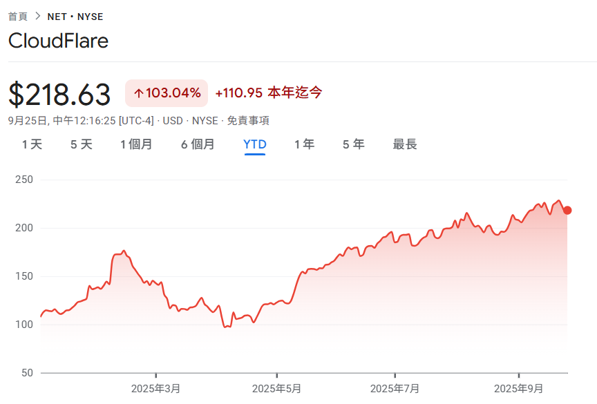 據谷歌財經數據 顯示 ,Cloudflare 股票今年至今已經上漲了 103%,公司市值增長至 757 億美元。