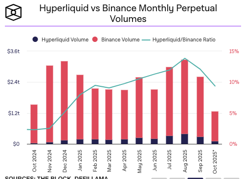 而在同一天,全球最大的交易所币安却因技术问题陷入部分系统故障,但这实际并不能说明目前的 Hyperliquid 已经比币安性能更高,因为双方面对的系统压力并不同,在 10 月 11 日,Hyperliquid 的永续合约交易量超 100 亿美元,而币安的交易量是其 10 倍以上。 The Block 数据 显示,9 月份 Hyperliquid 的合约交易量为 2824.7 亿美元,而币安的合约交易量为 2.34 万亿美元,Hyperliquid 的合约交易量仅为币安的 12%。