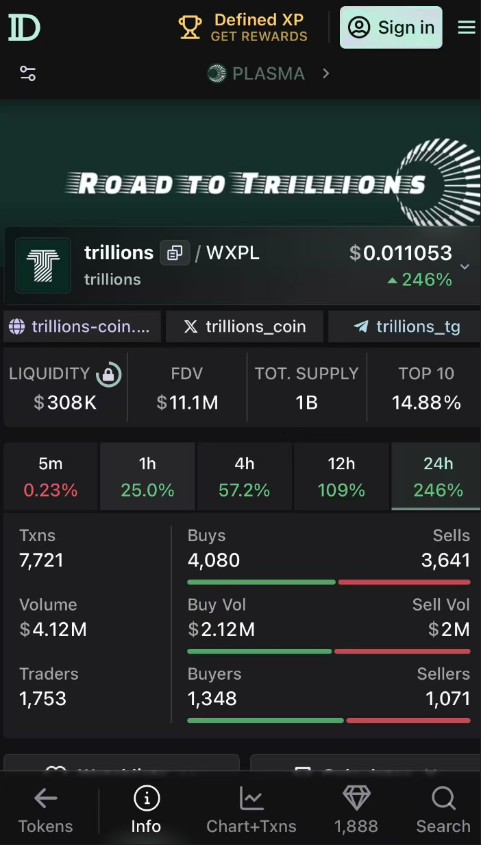 9月28日,他似乎又找回了感觉, 通过波段Trillions和其他XPL的meme大赚839U,资金重新突破2000U。