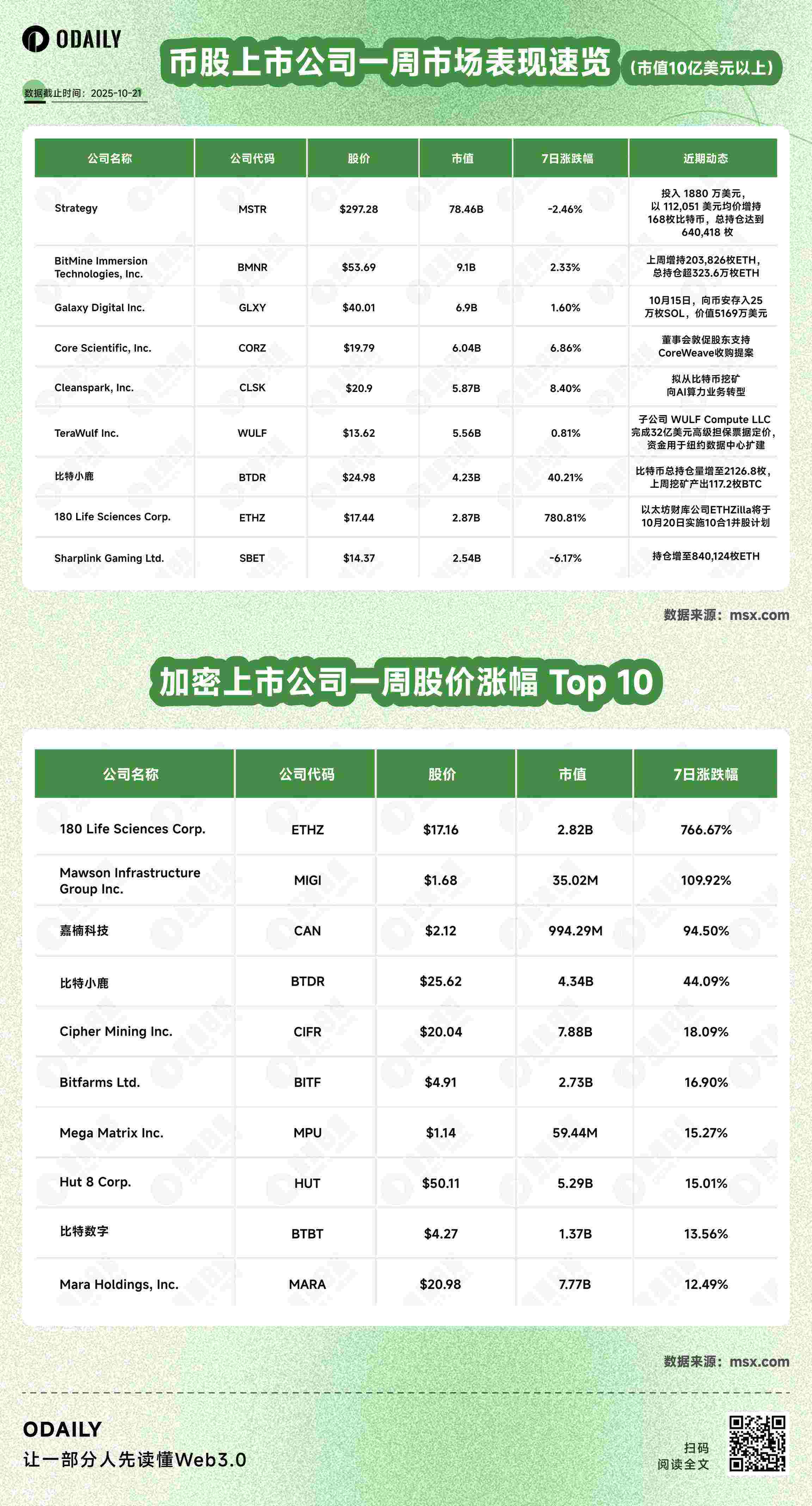 编者按:经历了一周的价格修复,不少执行 DAT 策略的上市公司仍在持续增持各类代币。但或受到国内政治局势更迭影响,以 Metaplanet 为代表的日本上市公司暂时停下了囤币脚步。此外,不少上市公司选择转型以寻找业务第二增长曲线。以下为 Odaily 星球日报总结整理的上周币股市场信息, 所有美股数据皆来自 msx.com 。