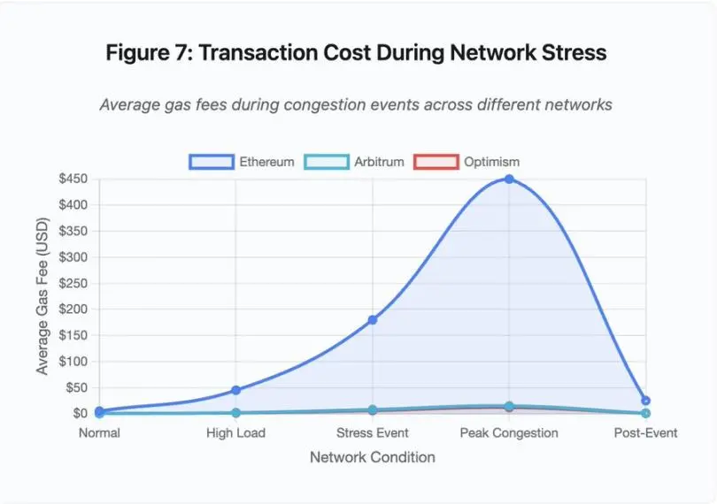 这些事件揭示了一个一致的模式:系统为正常负载配置资源,然后在压力下灾难性地失败。Solana 有效处理了常规流量,但在交易量增加 10,000% 时崩溃。以太坊 Gas 费保持合理,直到 DeFi 采用引发拥堵。Optimism 的基础设施运行良好,直到 25 万个地址同时申领空投。币安的 API 在正常交易期间功能正常,但在清算连锁期间受到限制。