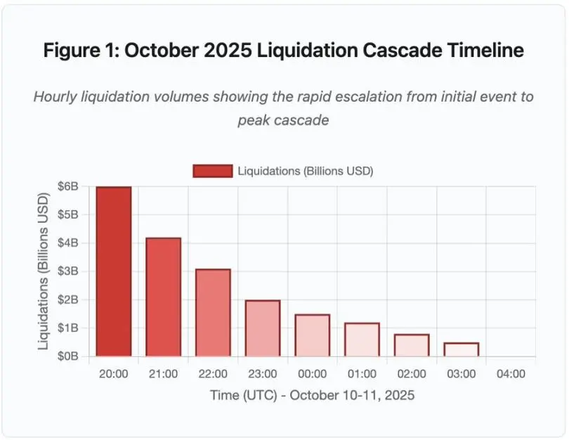 2025 年 10 月 10-11 日的清算连锁事件为基础设施故障模式提供了一个具有启发性的案例研究。在 UTC 时间 20:00,一项重大的地缘政治公告引发了市场范围的抛售。一小时内,发生了 60 亿美元的清算。到亚洲市场开盘时,160 万交易者账户中已有 193 亿美元的杠杆头寸蒸发。
