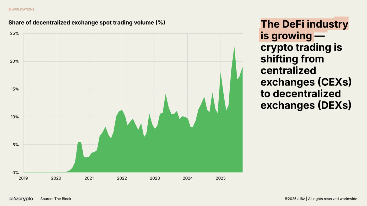链上经济 —— 曾经只是早期采用者的小众试验场 —— 如今已经演变成一个跨多个行业的庞大市场,每月有数千万活跃参与者。如今,近五分之一的现货交易量已经在去中心化交易所(DEX)上进行。