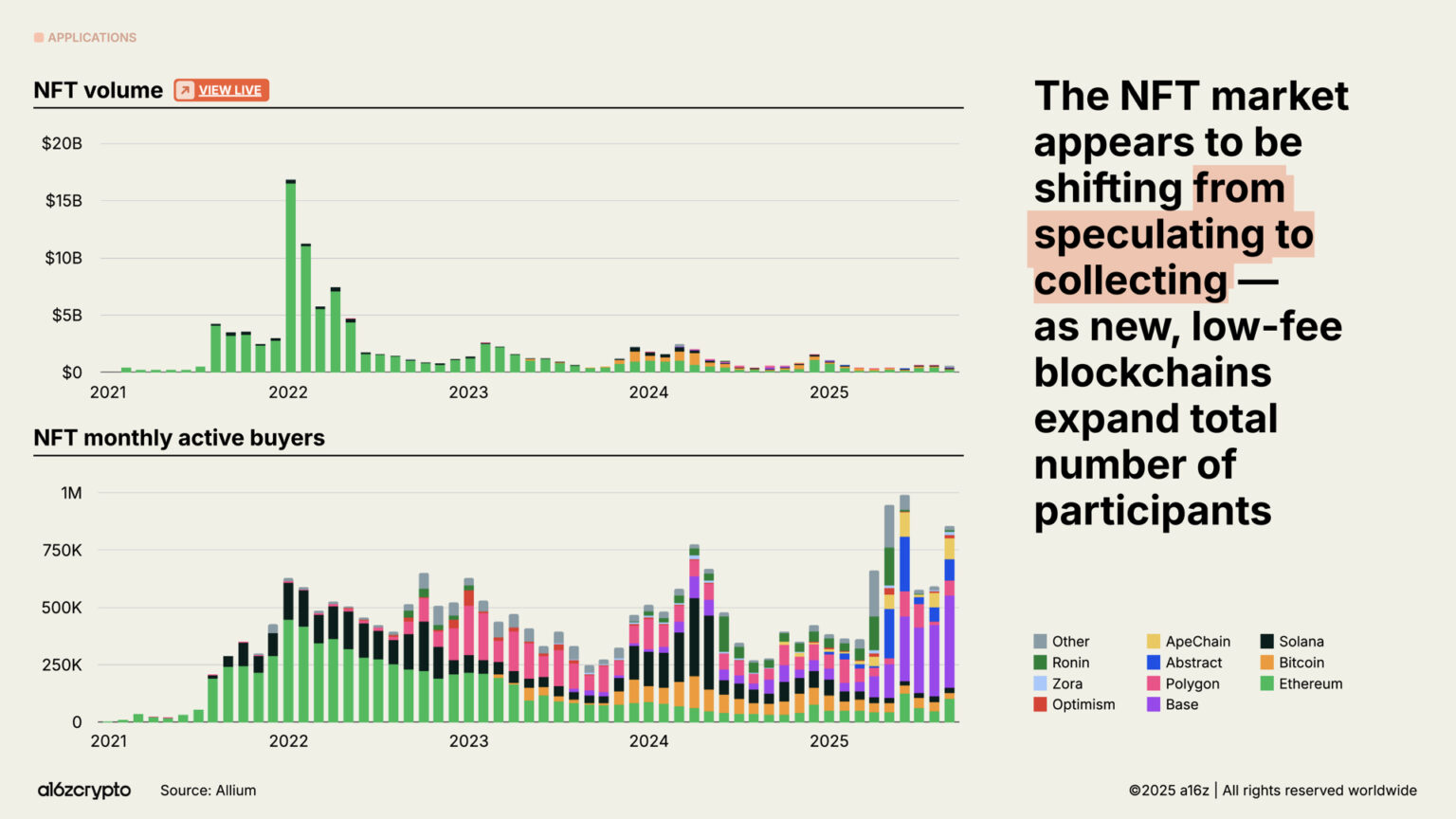 NFT 市场的总体交易量虽然远不及 2022 年的高峰,但月活买家数量正在稳步上升。这些趋势似乎预示着消费者行为正从投机转向收藏,而 Solana、Base 等链上更低廉的区块空间为此提供了实现条件。