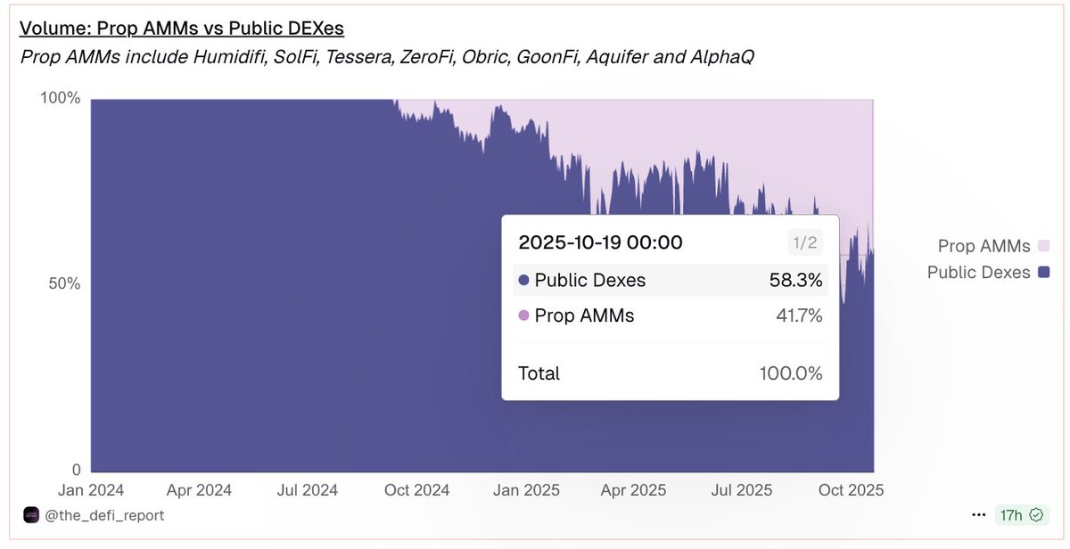 专业自动做市商(Proprietary AMMs,简称 Prop AMMs)正在迅速成为 Solana DeFi 生态中的主导力量,目前它们已经贡献了主要交易对中超过 40% 的交易量。这类由专业做市商运营的专门流动性场所,能够提供深度流动性和更具竞争力的定价,核心原因在于它们显著降低了做市商被利用“过期报价”(stale quotes)进行抢跑(front-running)套利的风险。