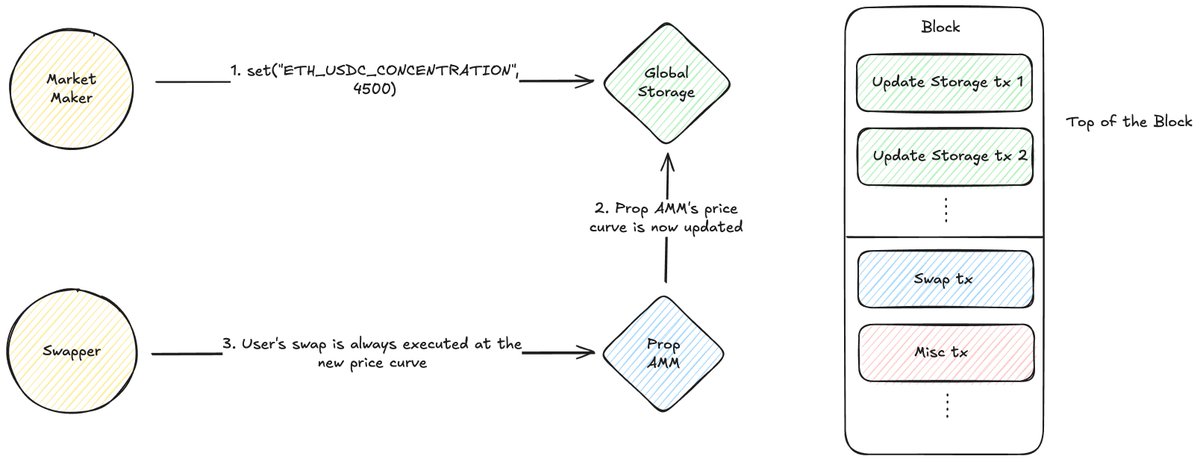 虽然标准 EVM 架构使此类操作成本高、风险大,但新的设计为解决这个问题提供了不同的方法。结合链上全局存储智能合约和链下构建器策略的新设计,可创建专用“快速通道”,保证区块顶部执行更新,同时建立本地、受控的费用市场。这不仅使 Prop AMM 在 EVM 上可行,也可能为所有依赖区块顶部预言机更新的 EVM DeFi 带来变革。
