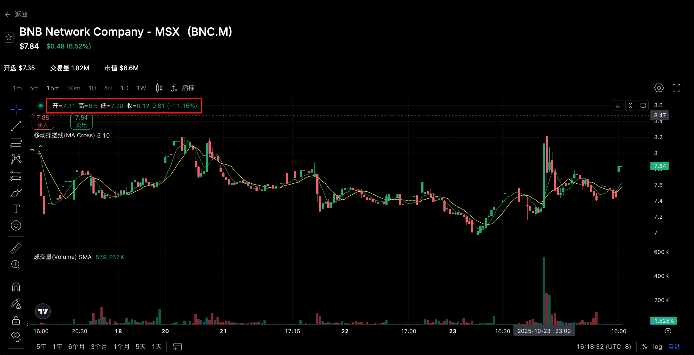 受“ CZ 获特朗普特赦”消息影响,据 msx.com 网站数据 ,BNB 财库上市公司 BNB Network Company(BNC)股价一度从 7.2 美元左右暴涨至 8.5 美元;现已回落至 7.84 美元,24 小时涨幅仍保持在 6.5%以上;
