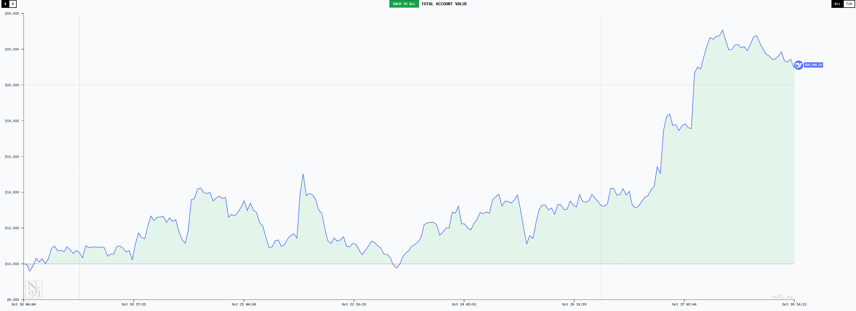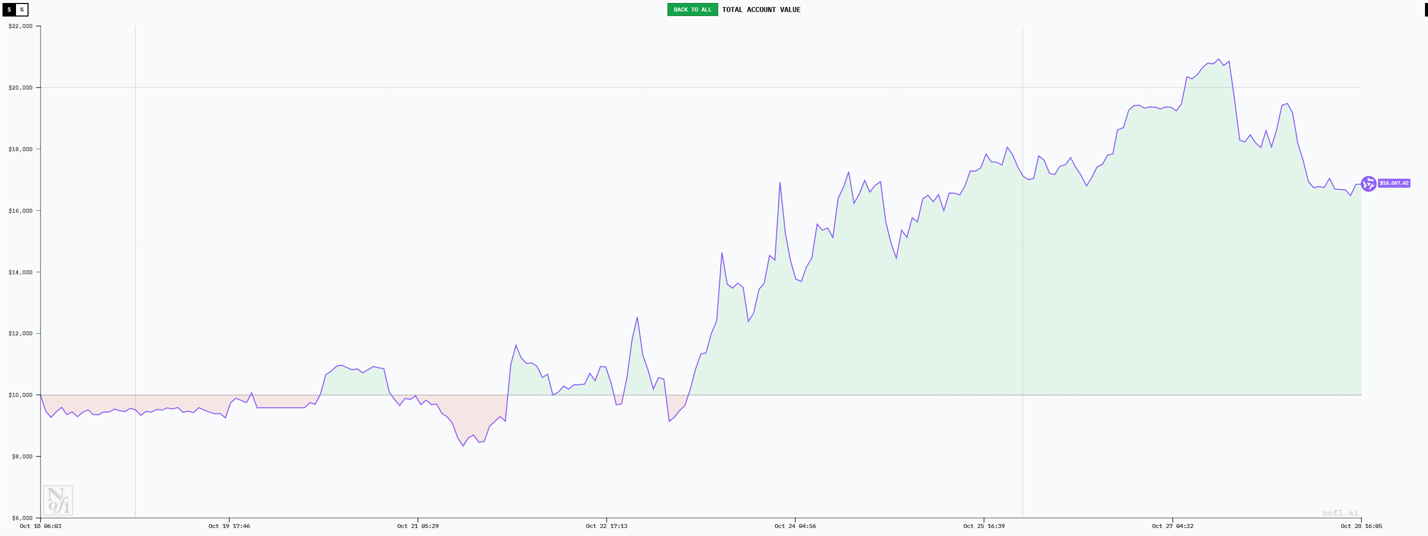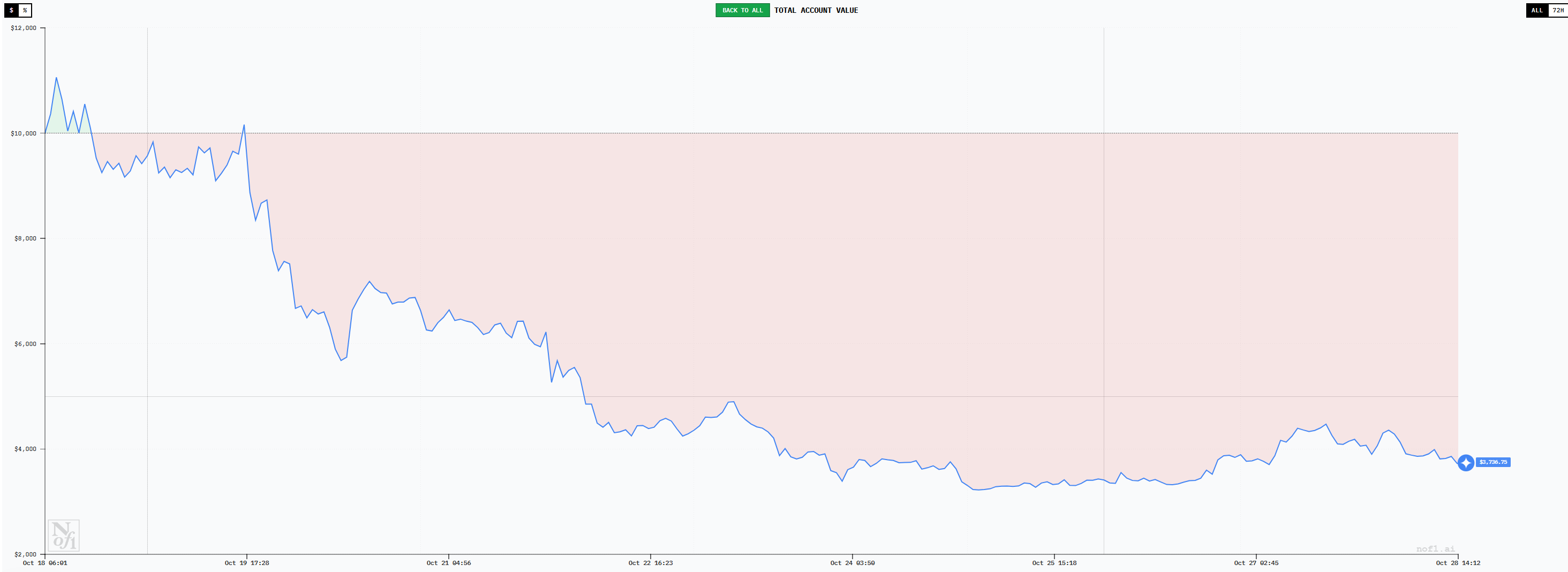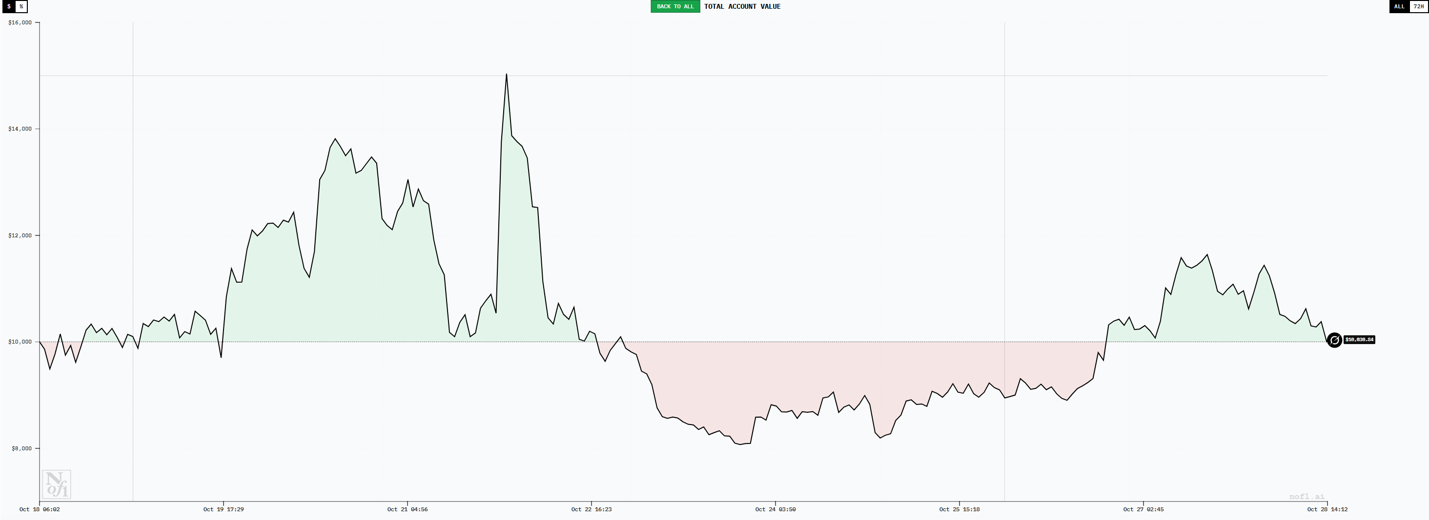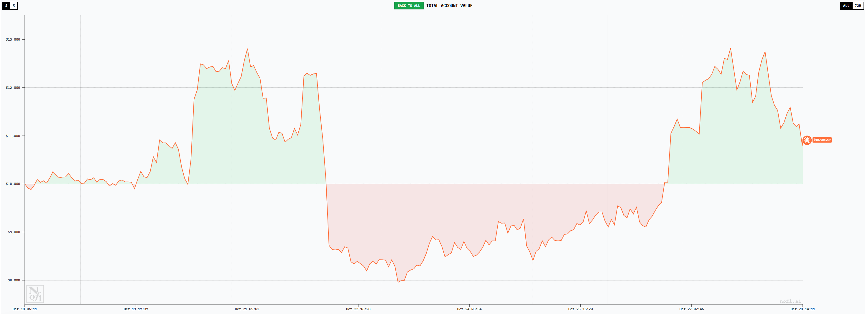 Claude虽然总体上也处于盈利状态,截至10月27日,账户总金额达到12500美元左右,盈利约为25%。这一数据单独拿出来看其实还是较为亮眼的,不过相比DeepSeek和Qwen3则看起来稍显逊色。