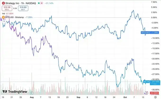 近期,我们已看到这些 DAT 股票市值大幅缩水:MSTR 下跌 44%,Metaplanet 跌幅超过 70%。这些风险被市场充分定价,显示出 DAT 模式可能正在失去动力,也解释了为何在当前牛市阶段,DAT 的表现不如其所持加密资产。