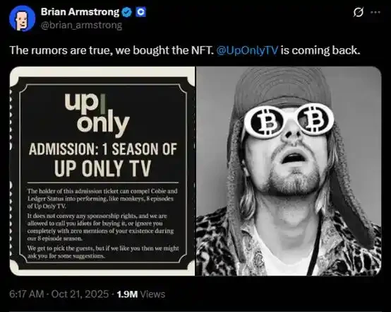 10 月 21 日,Coinbase 花费 2500 万美元从 Cobie 手中购入 UpOnly NFT。随后 Coinbase CEO Brian Armstrong 发文证实该消息的真实性。Brian 表示,「持有此入场券(NFT)的人,可以强迫 Cobie 和 Ledger Status 像猴子一样表演,录制 8 集《Up Only TV》节目此门票不赋予任何赞助权利,而且我们有权称你为「买这玩意儿的傻瓜」,或完全无视你的存在——在整个 8 集节目中不提你一字。嘉宾由我们自行决定,但如果我们觉得你挺有意思,或许会听听你的建议。」