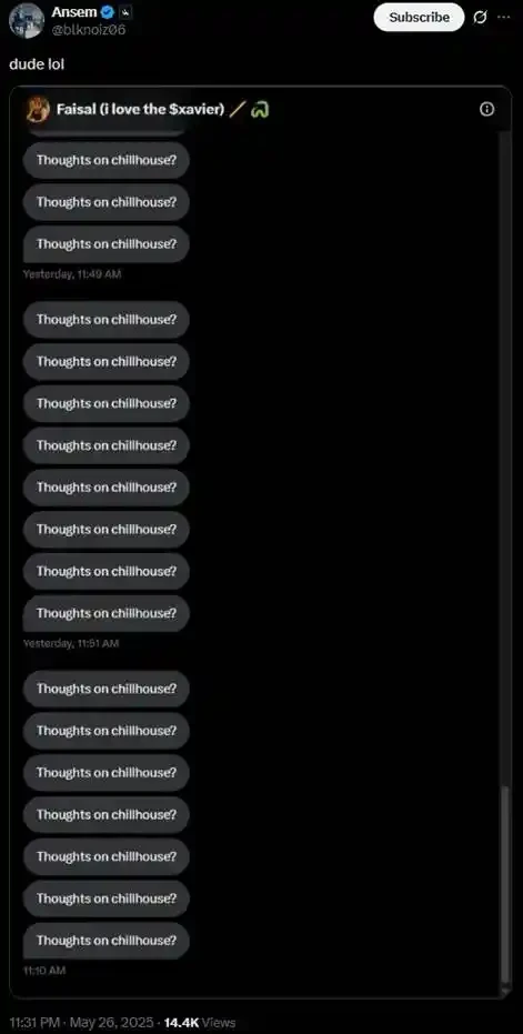 「短信轰炸」最终把 Ansem 给炸了出来,「Thoughts on chillhouse?」成为了 Solana 生态的梗,现在看到评论区中英文区玩家们时不时莫名其妙地跳出一句「Thoughts?」,其实就是该梗的简化。该梗并不是真的要问 KOL 们对 Chillhouse 的看法,更多是一种「牛皮糖式」的吸引关注的耍宝,就像我的朋友问我,今天天气如何?而我直接蹦出三句,你怎么看 Chillhouse?不分对象,也不分场景。