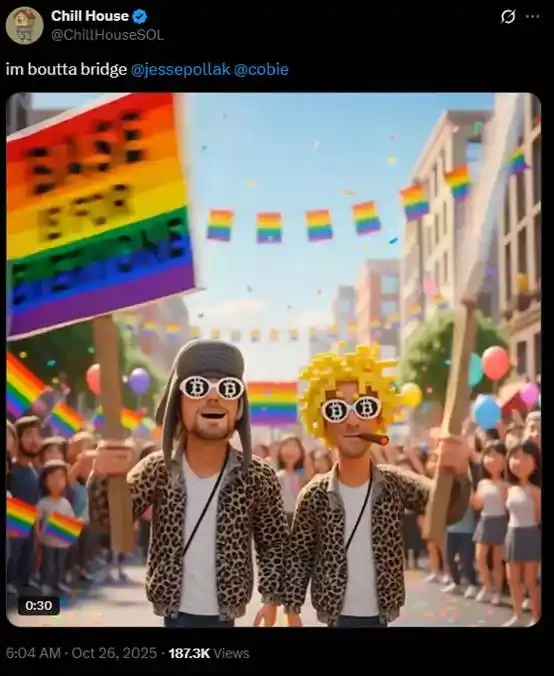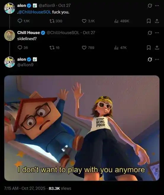10 月 27 日,Chillhouse 日常抽风,「我操你的 Toly,我操你的 Mert(Helius CEO),我操你的 Solana 基金会」。