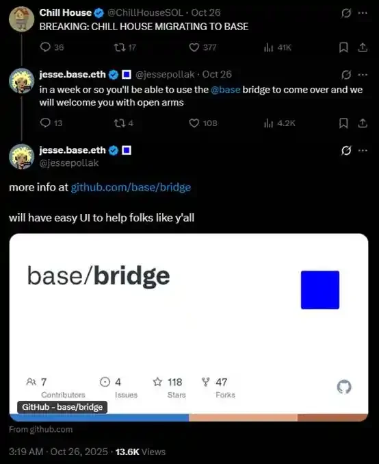 那么 Jesse 真实的意图是什么?如果不靠猜测,只凭公开的推文来看的话,Jesse 想的是吸引 Solana 上优质的 meme 社区以及 dev。看下面这条推文就可以看到,Chillhouse 在抽风,但 Jesse 在评论区却很认真地把 Base 跨链桥的 Github 页面都给发上来了: