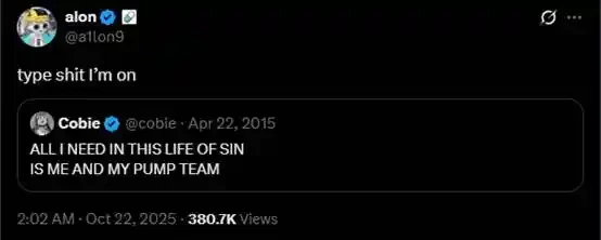 10 月 22 日,alon 转发了 Cobie 发表于 2015 年的一条推文。Cobie 的原推文为,「在这罪恶的生活中,我需要的只有我自己和我的 Pump 团队」。alon 的引用推文为,「这就是我现在干的事」。