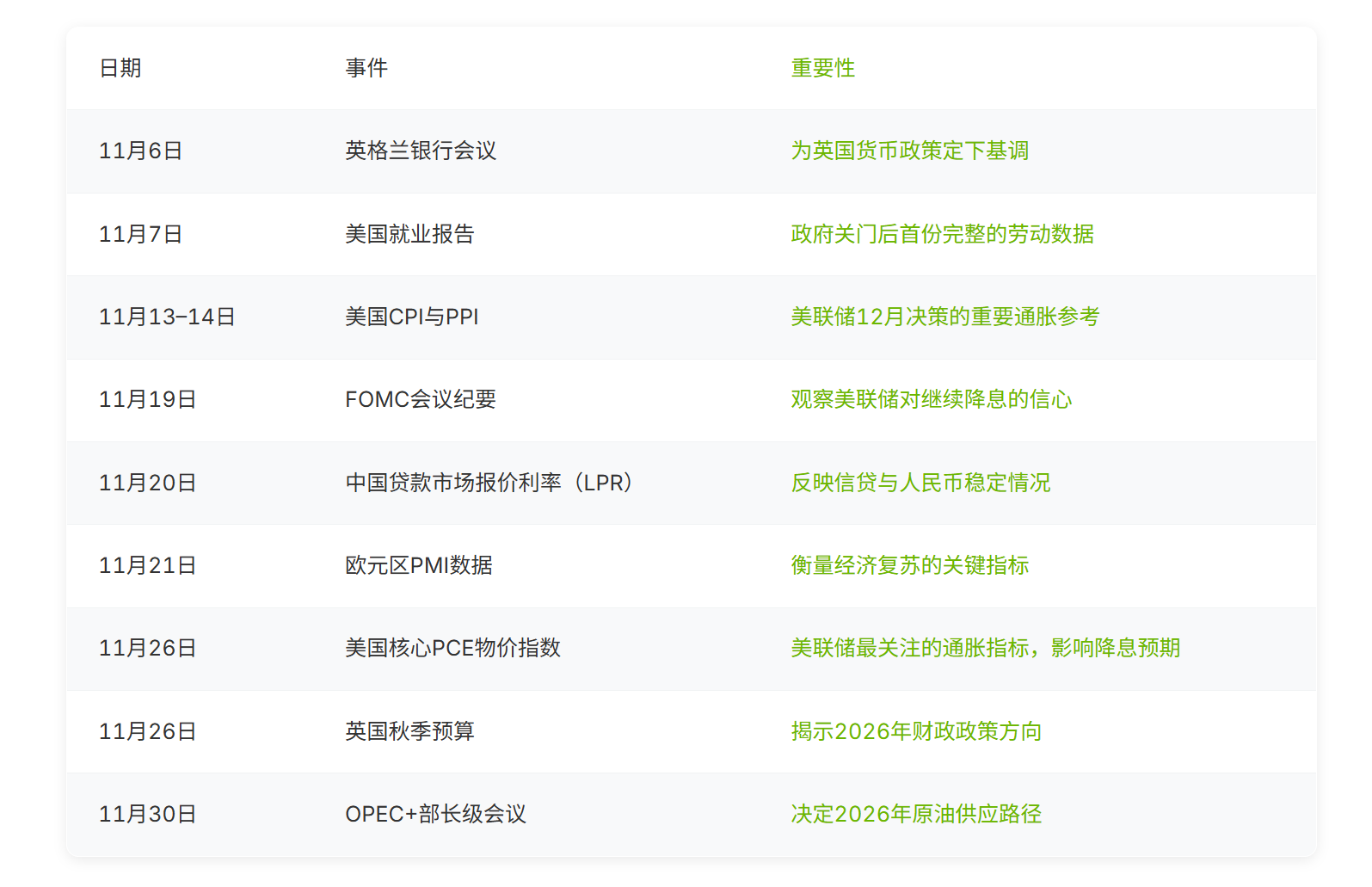 对传统金融市场来说,11月是一场“现实考验”。各国央行正试探宽松政策的边界,看看能否在不重新推高通胀的情况下继续降息。能源价格在剧烈波动后趋于平稳,而英国等主要经济体即将公布的财政计划,也将揭示各国如何在迈向2026年的过程中,在经济增长和财政纪律之间找到平衡。